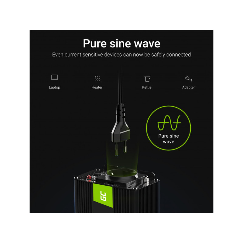 Качествен автомобилен конвертор или инверторът Green Cell позволява захранване на устройства, които са оборудвани с обикновен електрически щепсел. Инверторът се свързва директно към батерията (кабелът е включен), има температурна защита и CE и RoHS сертификати. Разполага с охладителна система Turbo Cooling. Има вграден ключ за включване/изключване и LED светлини, които показват състоянието на инвертора. Предназначен е за захранване на лаптопи, малки телевизори, осветителни тела, вентилатори, различни захранвания и др. 5V USB изход също се предлага отделно. Инверторът осигурява чиста синусоида на изходното променливо напрежение, което позволява безпроблемната работа и на най-чувствителните устройства.