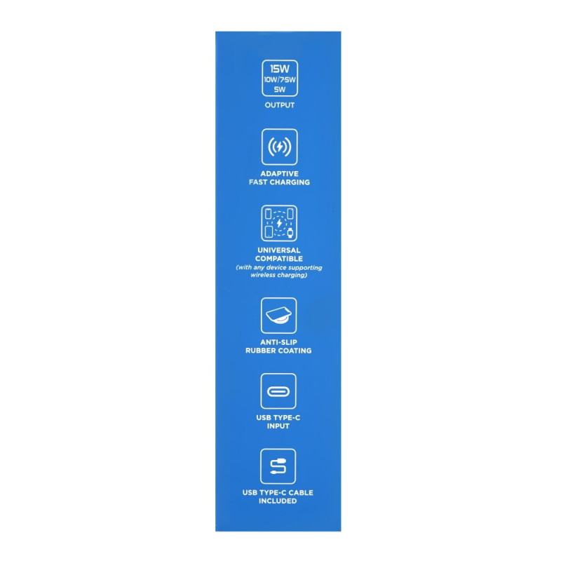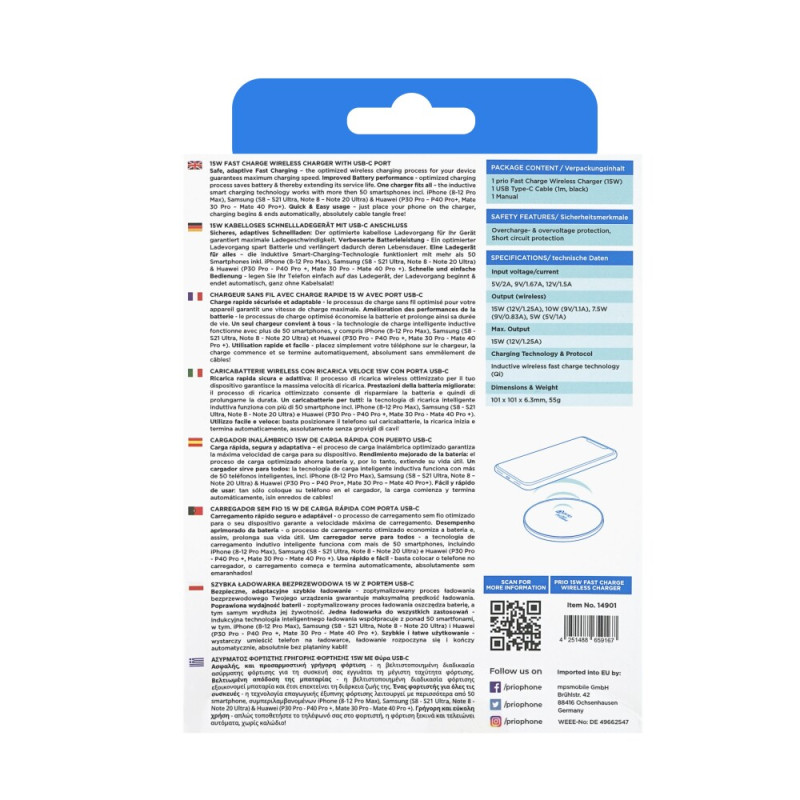 Универсалното безжично индукционно зарядно от Prio позволява безжично зареждане на смартфони, които поддържат стандарта Qi. Зареждането на телефона е лесно, като е достатъчно да го поставите върху табелата на зарядната станция. Изходната мощност на зарядната станция, която е свързана към източник на захранване с USB-C конектор, е 15 W. Максималният ток на зареждане е 2A. Включен е USB-C кабел.