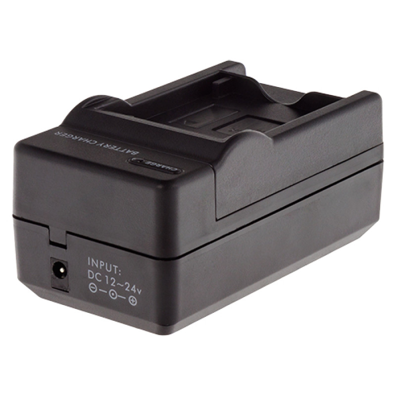 Компактно настолно зарядно устройство за зареждане на батерии за фотоапарати/видеокамери, което може да се включи в обикновен електрически контакт или в автомобилен контакт. LED индикаторът за състояние показва състоянието на зареждане на батерията. Зарядното устройство се изключва автоматично, когато батерията е пълна.